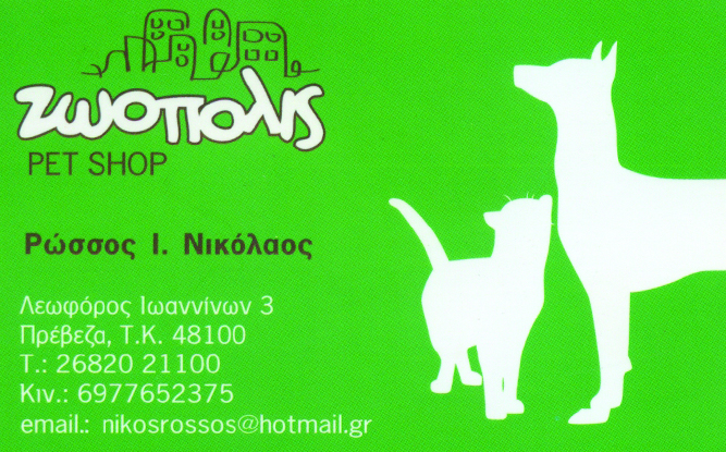 customer tabsΕπικοινωνίαΚτηνιατρεία και Κτηνιατρικές ΚλινικέςΥγείαΛεωφορος Ιωαννινων 3 , ΠρέβεζαΠΡΕΒΕΖΑΗΠΕΙΡΟΣ 2682021100 6977652375nikosrossos@hotmail.com Το προτείνω (έχει προταθεί 0 φορές) ΦωτογραφίεςFacebook LikeShare on FacebookTweet Widget